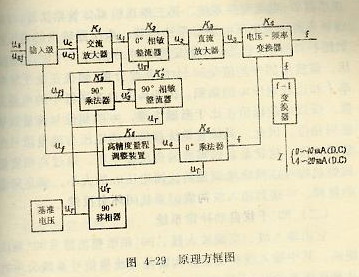 在圖4-29所示的原理方框圖中有三個系統(tǒng):一個是流量信號閉環(huán)負反饋系統(tǒng);另一個是90°干擾自動補償系統(tǒng),還有一個是頻率-電流變換系統(tǒng)?,F(xiàn)分別介紹如下: