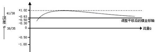 設(shè)計(jì)的調(diào)整齒輪是38/35,檢驗(yàn)誤差時(shí)若示值大與真值,即出現(xiàn)“+”誤差。例如+1.02~+0.3,見(jiàn)誤差調(diào)整圖,查調(diào)整齒輪表(見(jiàn)下圖),得知選用41/38調(diào)整齒輪比較合適,這樣誤差曲線的原點(diǎn)便由38/35 調(diào)整齒輪對(duì)應(yīng)的零位上移至41/38調(diào)整齒輪對(duì)應(yīng)的+0.63的位置。因而誤差曲線便處于新的坐標(biāo)系中,即誤差調(diào)整至+0.39~-0.33的范圍內(nèi),而流量計(jì)的準(zhǔn)確度達(dá)到要求。 |