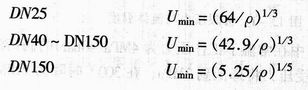 對于液體,根據圖中曲線,還給出了不同通徑最低流速的經驗公式